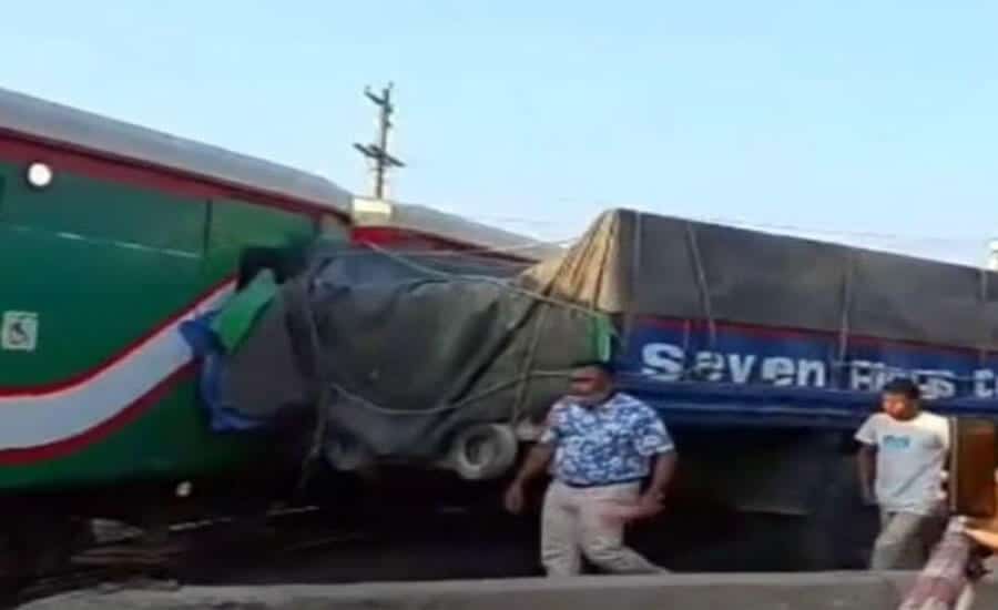 প্রত্যক্ষদর্শীরা জানান, ট্রাকটি রেললাইন পার হওয়ার সময় হঠাৎ করে আটকে যায়। চারদিকে চিৎকার-চেঁচামেচির মধ্যে ট্রাক সরানোর চেষ্টা করা হলেও সম্ভব হয়নি। ঠিক সেই মুহূর্তে পর্যটক এক্সপ্রেস এসে ট্রাকের পেছনে ধাক্কা দেয়। এতে ট্রেনের একটি এসি বগির দরজা ভেঙে যায় এবং কিছু দূর গিয়ে ট্রেনটি থেমে যায়।