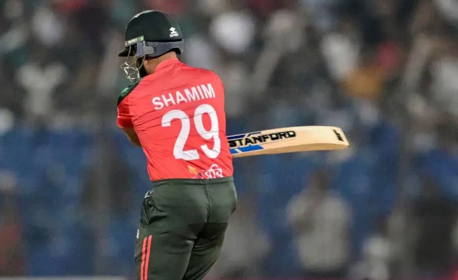১৬৬ রানের লক্ষ্য তাড়া করতে নেমে ঝড়ো শুরু করে বাংলাদেশ। ইনিংসের দ্বিতীয় ওভারেই আকিল হোসেনকে ছক্কা ও চারে আঘাত করে আগ্রাসনের ইঙ্গিত দেন তানজিদ হাসান। কিন্তু সেই আগ্রাসনই হয়ে ওঠে পতনের কারণ—মাত্র ৫ বলে ১৫ রান করে বিদায় নেন তিনি। এরপর থেকে শুরু হয় একের পর এক উইকেট পতন। লিটন দাস (৫), সাইফ হাসান (৮) ও শামীম হোসেন (১) দ্রুত ফিরলে পাওয়ারপ্লেতে ৪ উইকেট হারায় বাংলাদেশ।